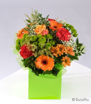 A seasonal selection of vibrantly coloured flowers handtied and delivered in a stylish bag.