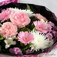 Delicate pink and white flowers wrapped and delivered in one of our gift bags. A wonderful gift.